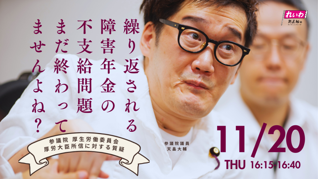 2025年11月20日 厚生労働委員会質疑「繰り返される障害年金の不支給問題 まだ終わってませんよね?」の文字起こしを公開 2025/11/25 最終更新日時 : 2025/11/25 tenbata5 2025年11月20日 厚生労働委員会質疑「繰り返される障害年金の不支給問題 まだ終わってませんよね?」の文字起こしを公開しました。ぜひご覧ください。 2025年11月20日 厚生労働委員会質疑「繰り返される障害年金の不支給問題 まだ終わってませんよね?」 ○天畠大輔君代読します。れいわ新選組の天畠大輔です。本日は、繰り返される障害年金の不支給問題について質問します。 昨年、障害年金をめぐる報道が起こり、私含め、様… 参議院議員 天畠大輔 公式サイト FacebookXBlueskyHatenaCopy