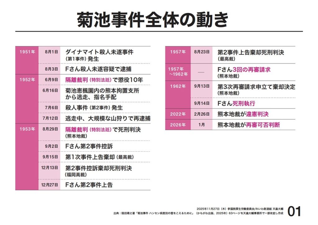 まず、菊池事件の概要です。資料一。一九五一年、村役場職員の家にダイナマイトが投げ込まれ、Fさんが逮捕されました。当時は、差別的ならい予防法の下、地域ぐるみで患者を見付け、通報、強制収容が全国でありました。被害者は過去にFさんを熊本県に通報していたため、恨みによる犯行だと警察は見込み捜査裁判はハンセン病療養所の中で行われ、懲役十年。まともな審議も弁護もない、傍聴人もゼロ。