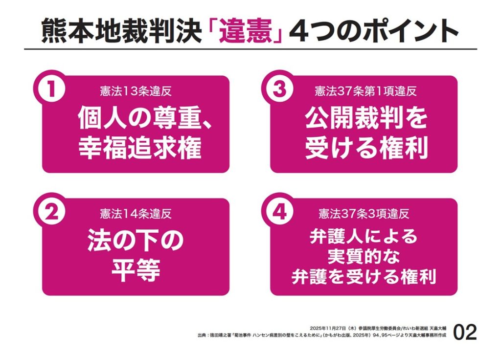 その一つで、冤罪事件でもある菊池事件について、十一月十四日の予算委員会で取り上げました。高市総理も最高裁も、元患者と御家族に明白に謝罪しました。当たり前のことではありますが、高く評価します。菊池事件が再審開始されることを私は信じて疑いません。そこで、本日は厚労省に質問します。