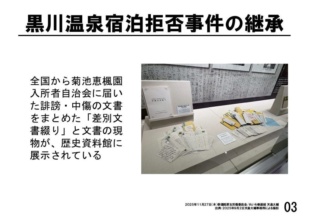 私は、議員になってから各地の療養所を訪ねています。今年九月には熊本県の菊池恵楓園にお邪魔しました。資料三と四を御覧ください。